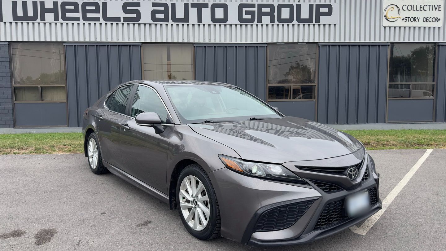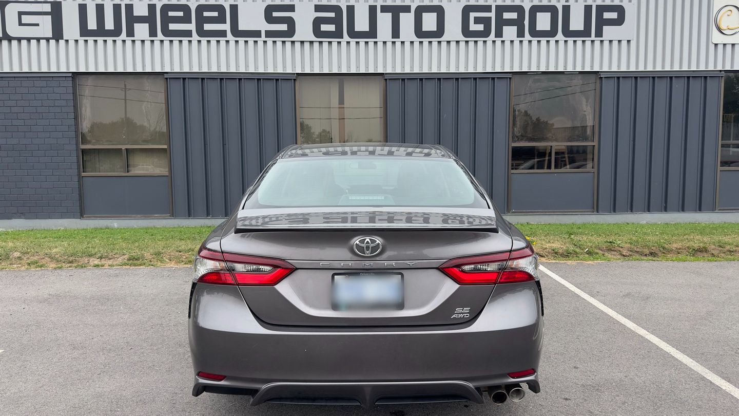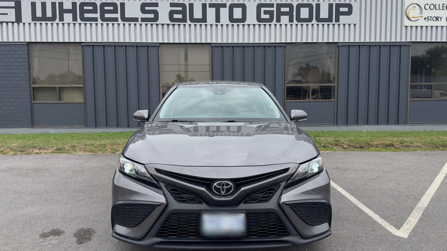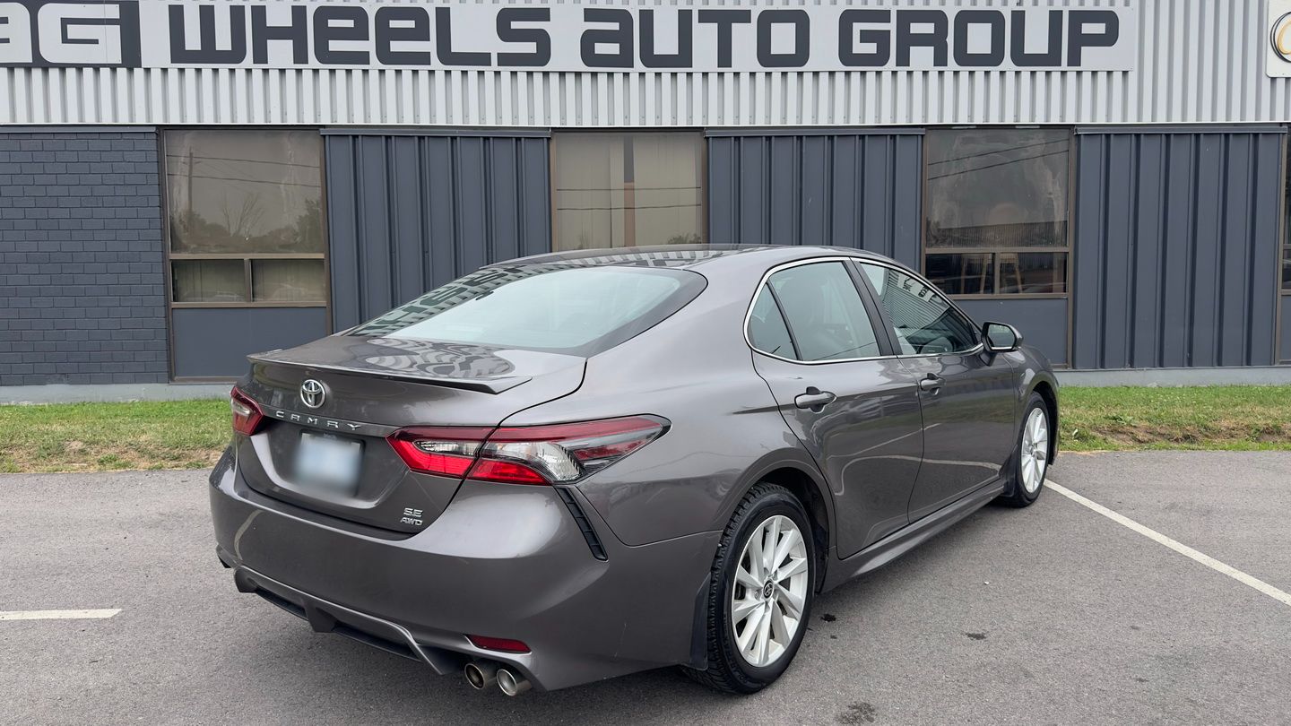 Powered by a 2.5L 4-cylinder engine and paired with an 8-speed automatic transmission, this Camry SE Nightshade with all-wheel drive offers a strong mix of efficiency, control, and everyday comfort. It has 103,085 km, a grey exterior, and a black leather interior, giving it a clean, sporty appearance. Features include climate control, radar cruise control, power seats, heated seats, heated steering wheel, blind spot monitoring, lane departure warning, front collision warning, reverse camera, Apple CarPlay, Android Auto, SiriusXM, keyless entry, rubber floor mats, and auxiliary power outlets.