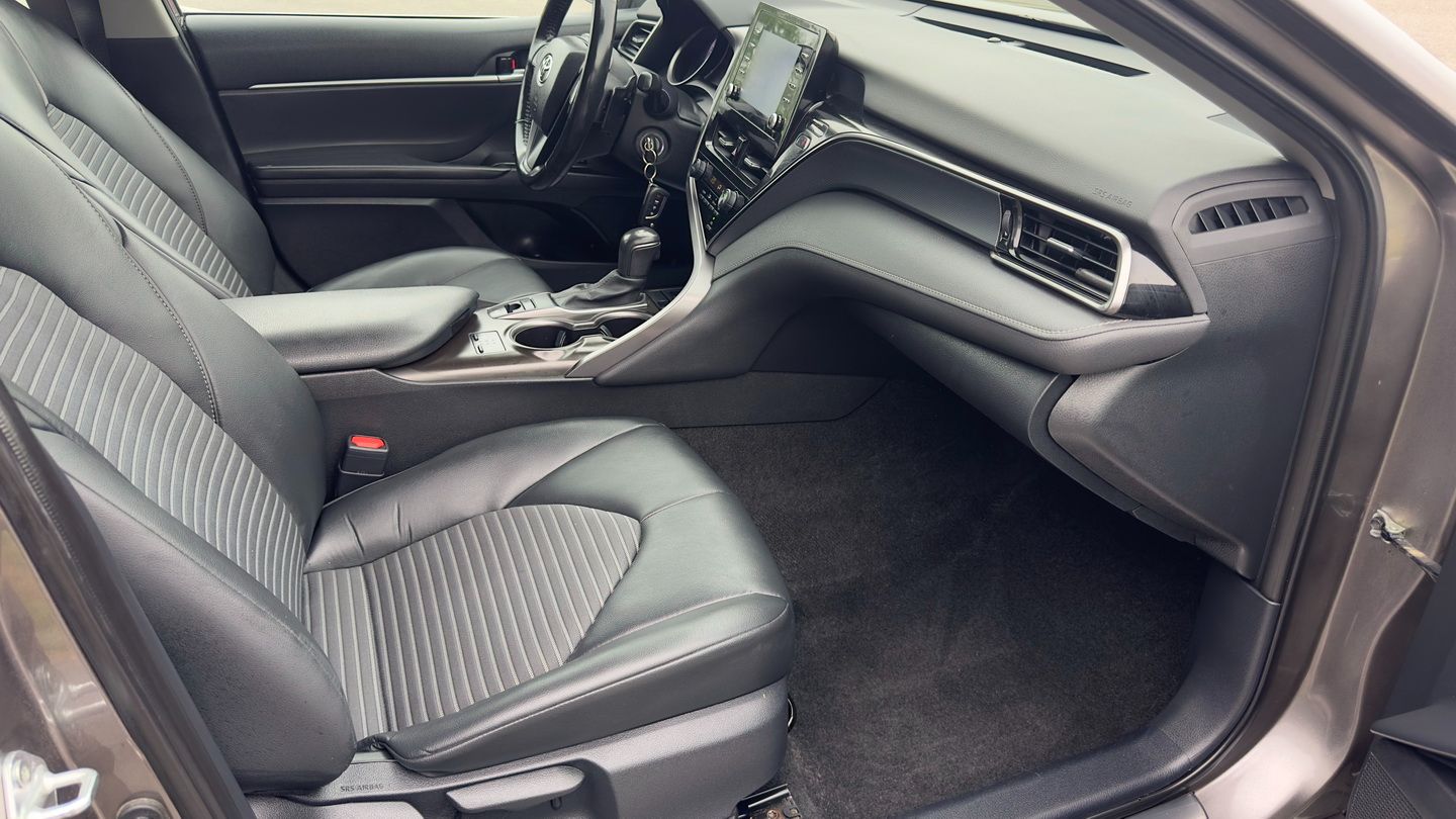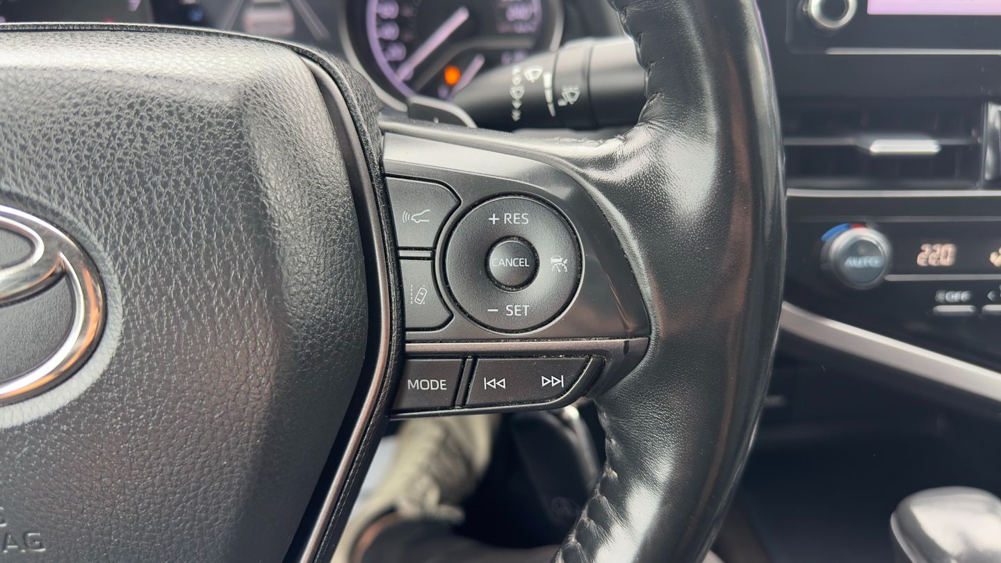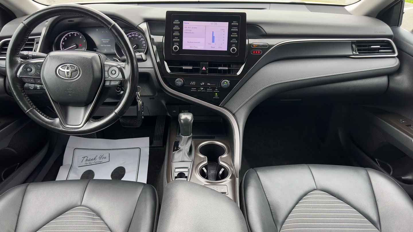 Powered by a 2.5L 4-cylinder engine and paired with an 8-speed automatic transmission, this Camry SE Nightshade with all-wheel drive offers a strong mix of efficiency, control, and everyday comfort. It has 103,085 km, a grey exterior, and a black leather interior, giving it a clean, sporty appearance. Features include climate control, radar cruise control, power seats, heated seats, heated steering wheel, blind spot monitoring, lane departure warning, front collision warning, reverse camera, Apple CarPlay, Android Auto, SiriusXM, keyless entry, rubber floor mats, and auxiliary power outlets.