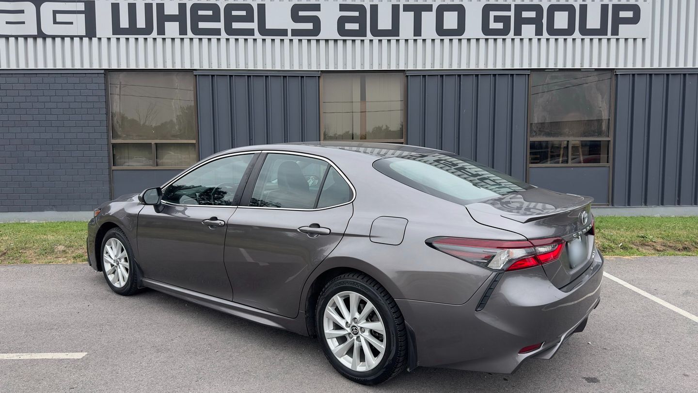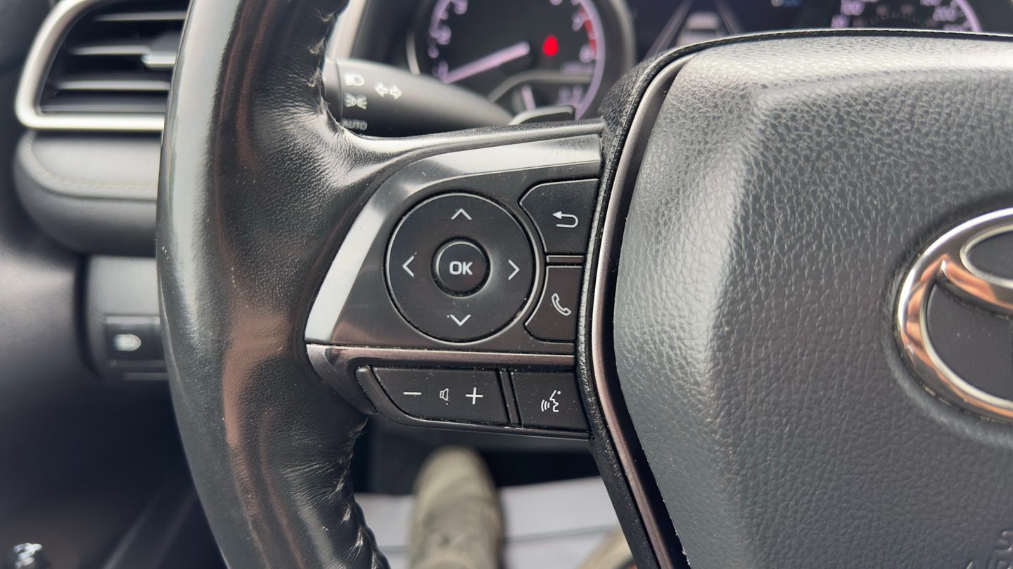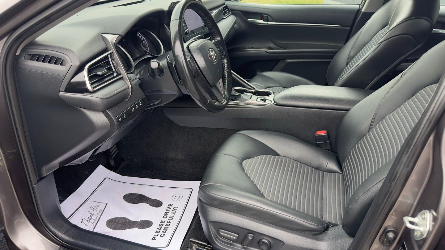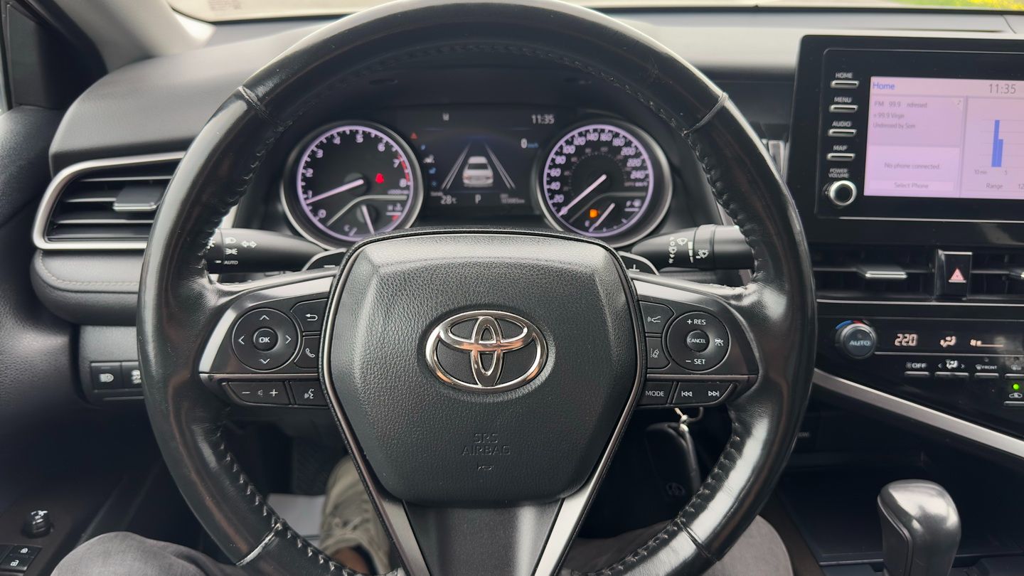 Powered by a 2.5L 4-cylinder engine and paired with an 8-speed automatic transmission, this Camry SE Nightshade with all-wheel drive offers a strong mix of efficiency, control, and everyday comfort. It has 103,085 km, a grey exterior, and a black leather interior, giving it a clean, sporty appearance. Features include climate control, radar cruise control, power seats, heated seats, heated steering wheel, blind spot monitoring, lane departure warning, front collision warning, reverse camera, Apple CarPlay, Android Auto, SiriusXM, keyless entry, rubber floor mats, and auxiliary power outlets.