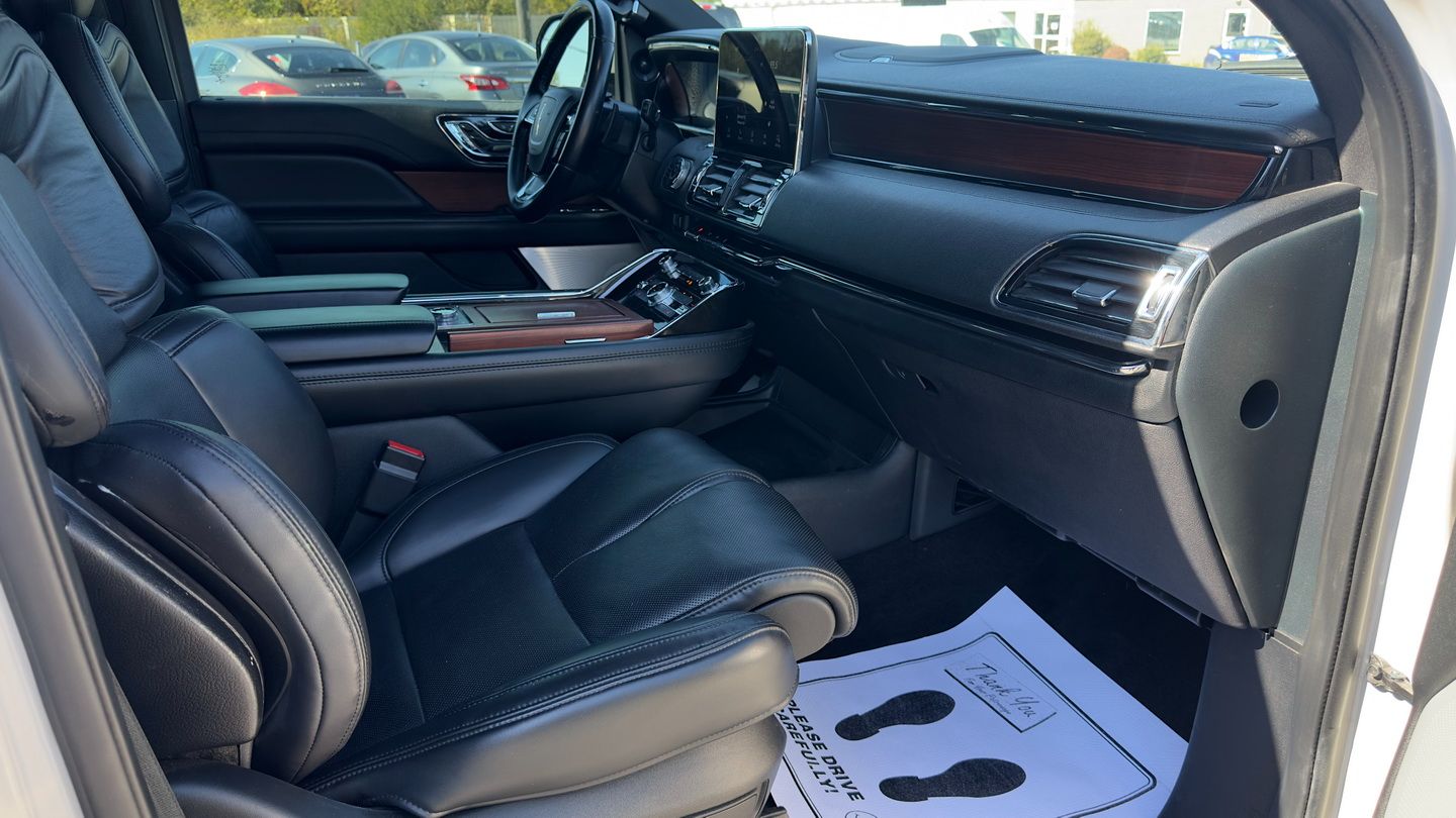 Designed for comfort and versatility, this long-wheelbase Navigator seats up to eight passengers and includes a power liftgate, remote start, keyless entry with push-button start, front and rear parking sensors, auxiliary power outlets, and both reverse and 360-degree cameras. Advanced safety technologies such as blind spot detection, lane keep assist, and lane departure warning are also included.