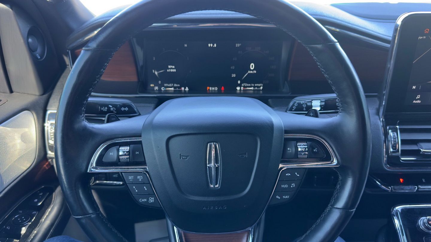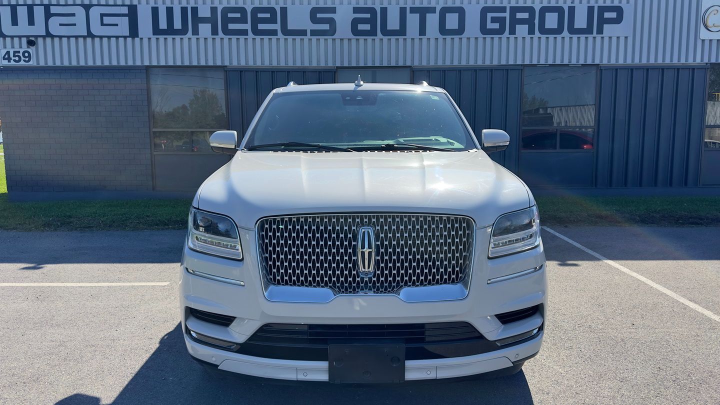 Powered by a 3.5L twin-turbo V6 engine and paired with an automatic transmission, this Navigator L Reserve delivers smooth power and confident four-wheel-drive capability. With 99,457 km, a Ceramic Pearl White exterior, and a black leather interior, it presents as a refined and spacious luxury SUV. Features include navigation, tri-zone climate control, advanced radar cruise control, power and memory seats, heated and cooled front seats, heated steering wheel, massage seats, heads-up display, panoramic sunroof, power running boards, and a premium infotainment system with Apple CarPlay, Android Auto, and SiriusXM.
