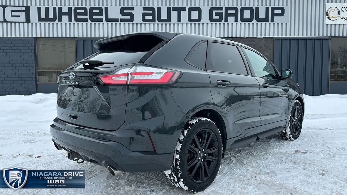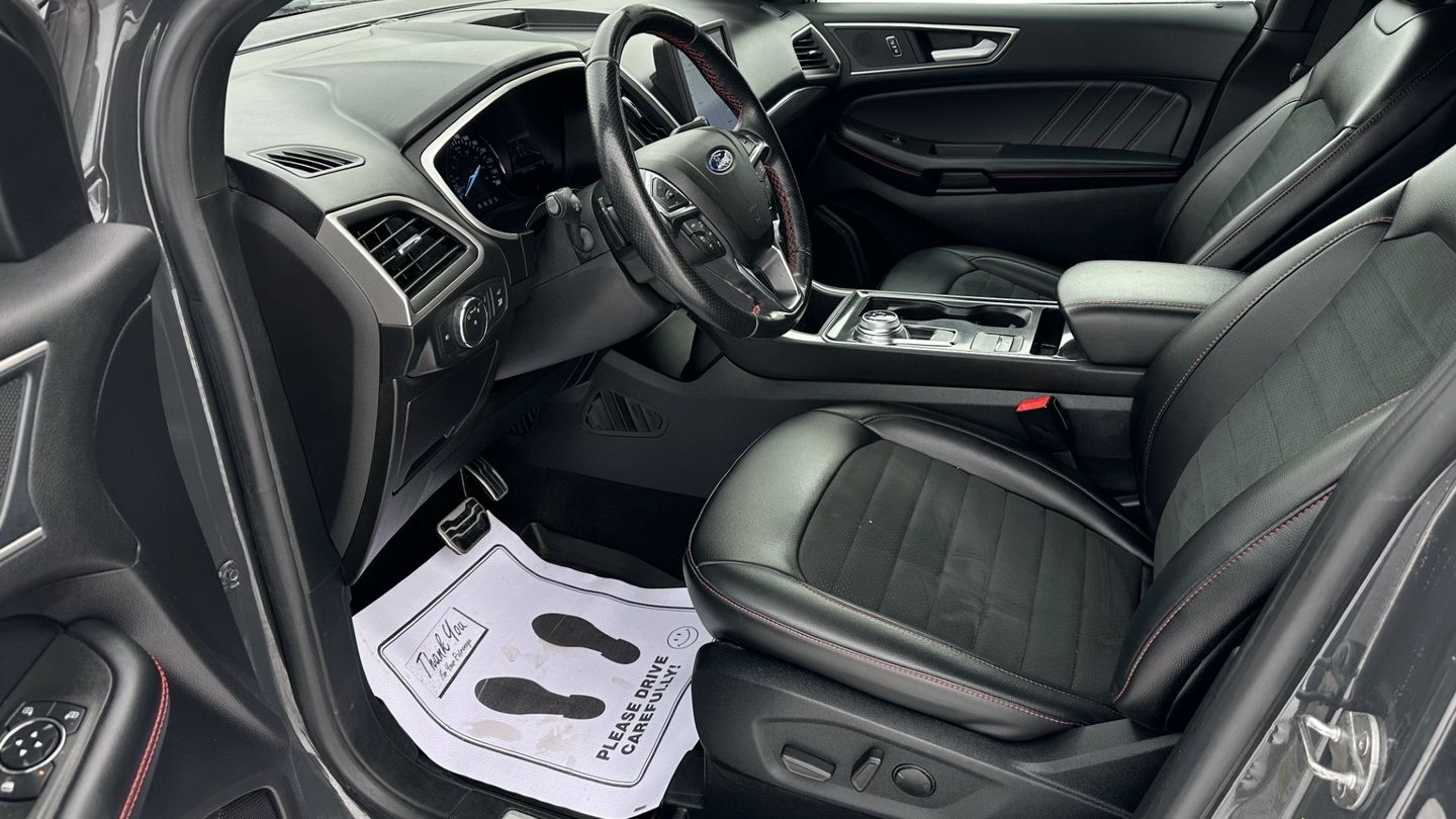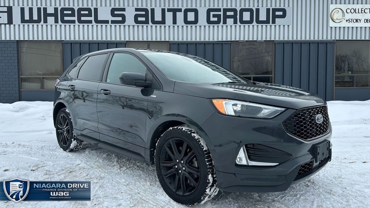 Powered by a 2.0L turbocharged 4-cylinder engine and paired with an automatic transmission, this Edge ST-Line delivers responsive performance with all-wheel-drive confidence. With 224,846 km, a grey exterior, and a black leather interior, it maintains a sharp, sporty appearance. Features include navigation, dual-zone climate control, power seats, heated seats, heated steering wheel, Apple CarPlay, Android Auto, SiriusXM, keyless entry with push-button start, remote start, auxiliary power ports, a reverse camera, rear parking sensors, and a panoramic sunroof.